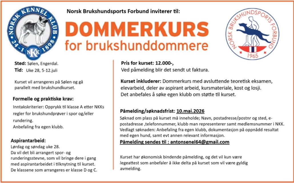 Vi inviterer til dommerkurs for brukshunddommere sommeren 2026.