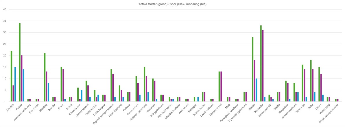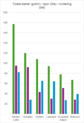 - Minst 44 forskjellige raser 🦮🐕🐩🐕🦺 har startet. BC har klart flest starter, etterfulgt av schæfer, golden, labrador, kelpie og malinois. Vi har laget en høyst uoffisiell statistikk over hvilke raser som har startet på NBF-prøver i år, se nedenfor. Statistikken viser antall starter per rase, m.a.o. kan en og samme hund stå for flere starter for den aktuelle rasen